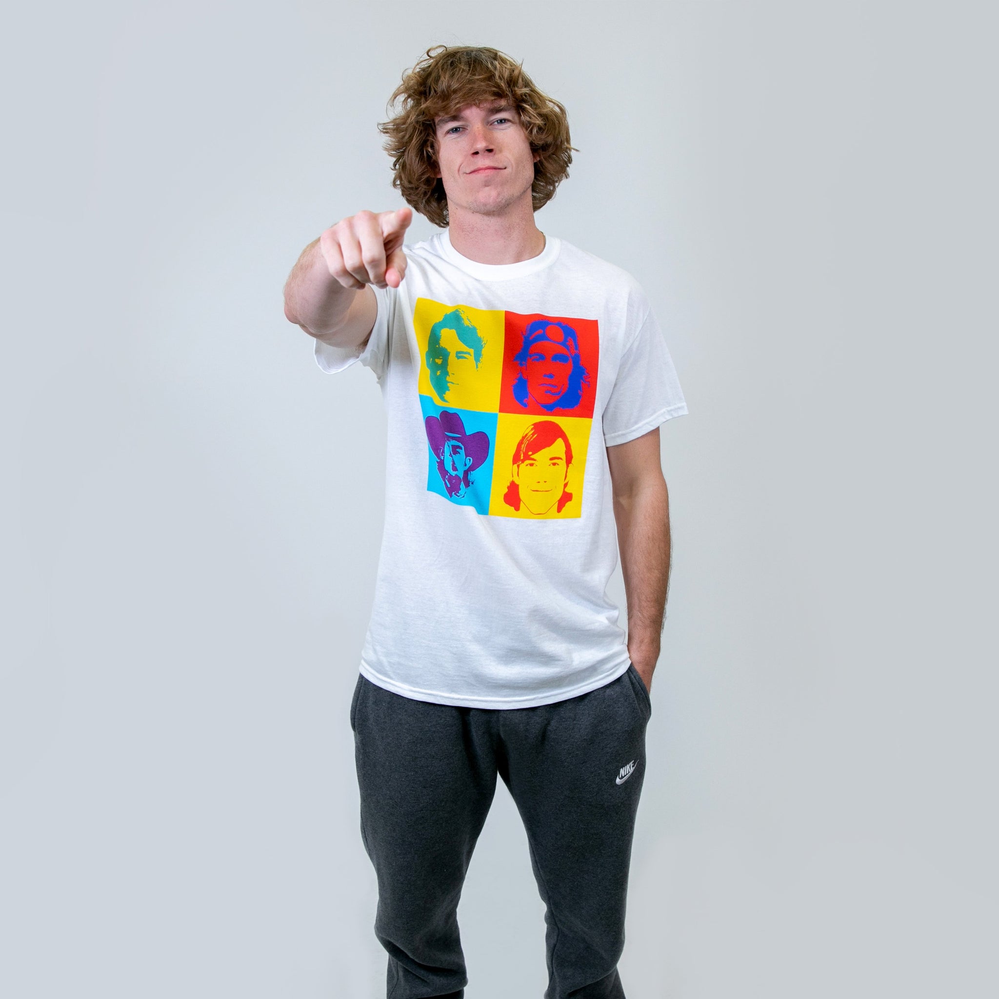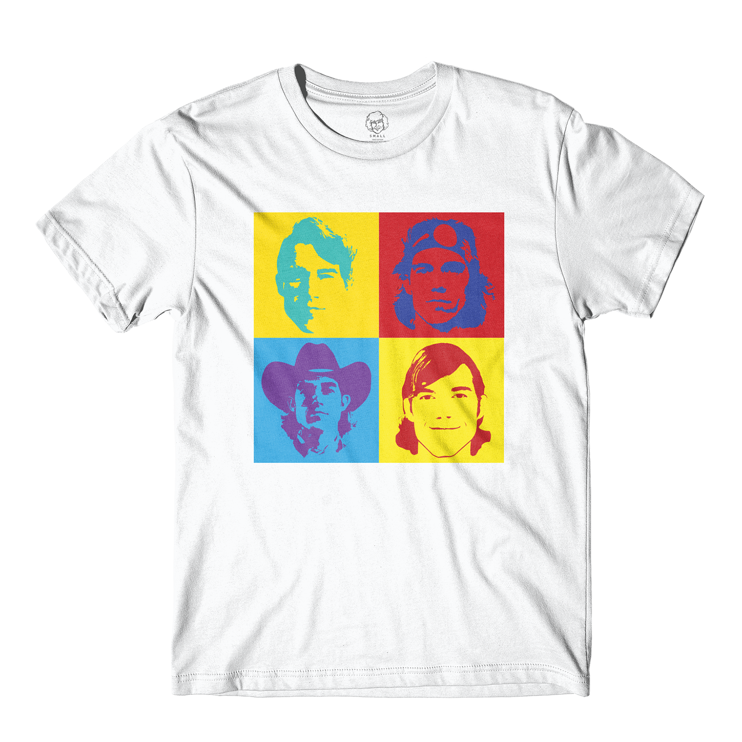 White t-shirt with multi-color ink print on the front